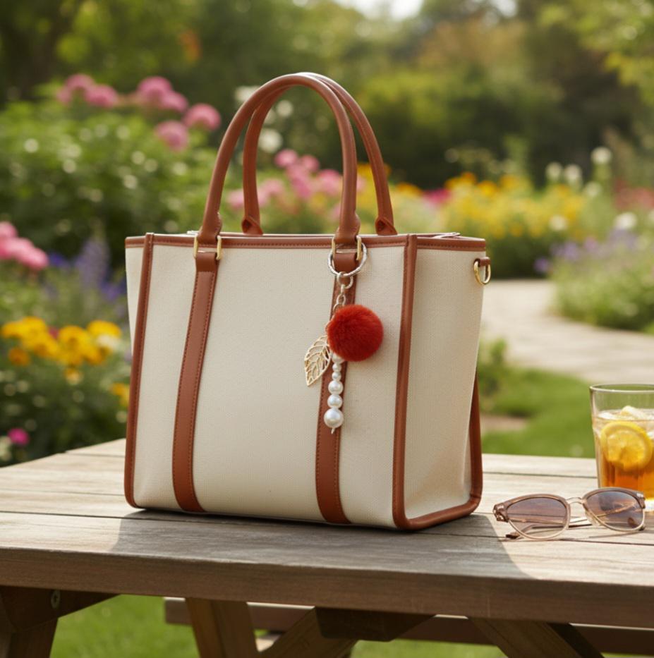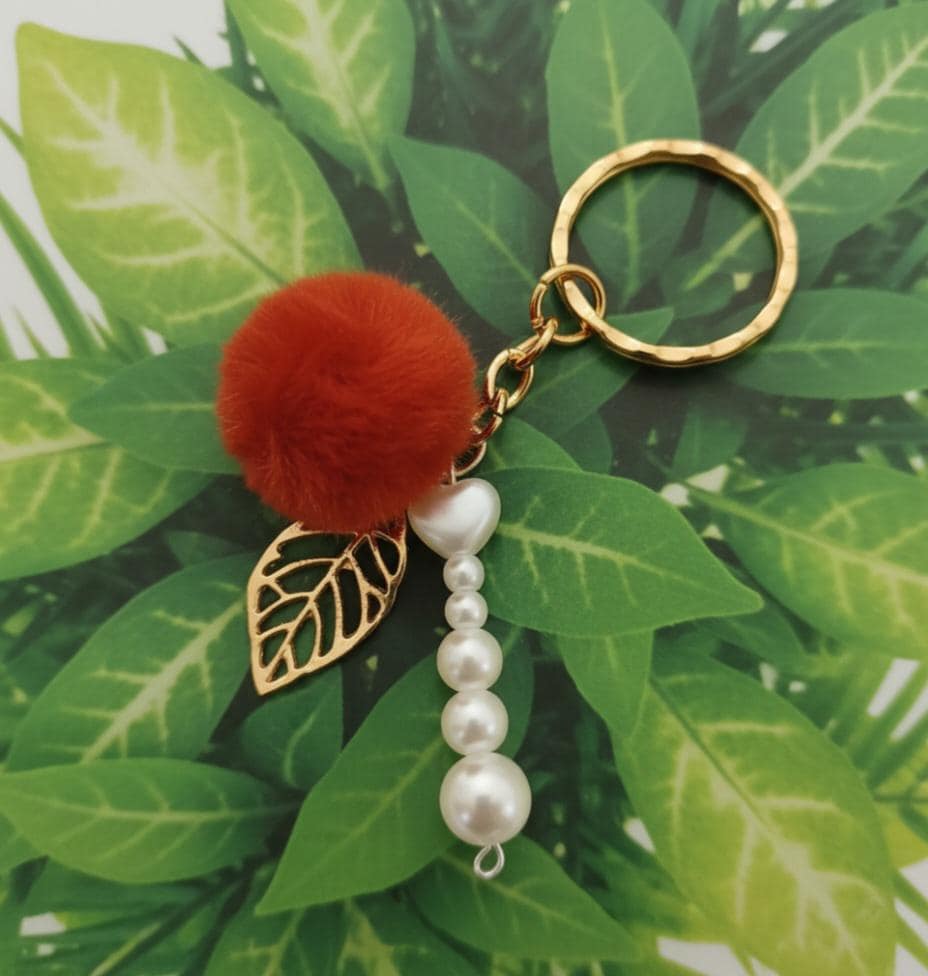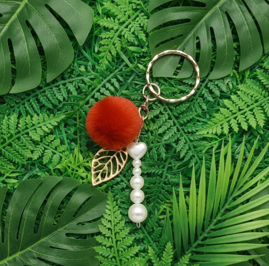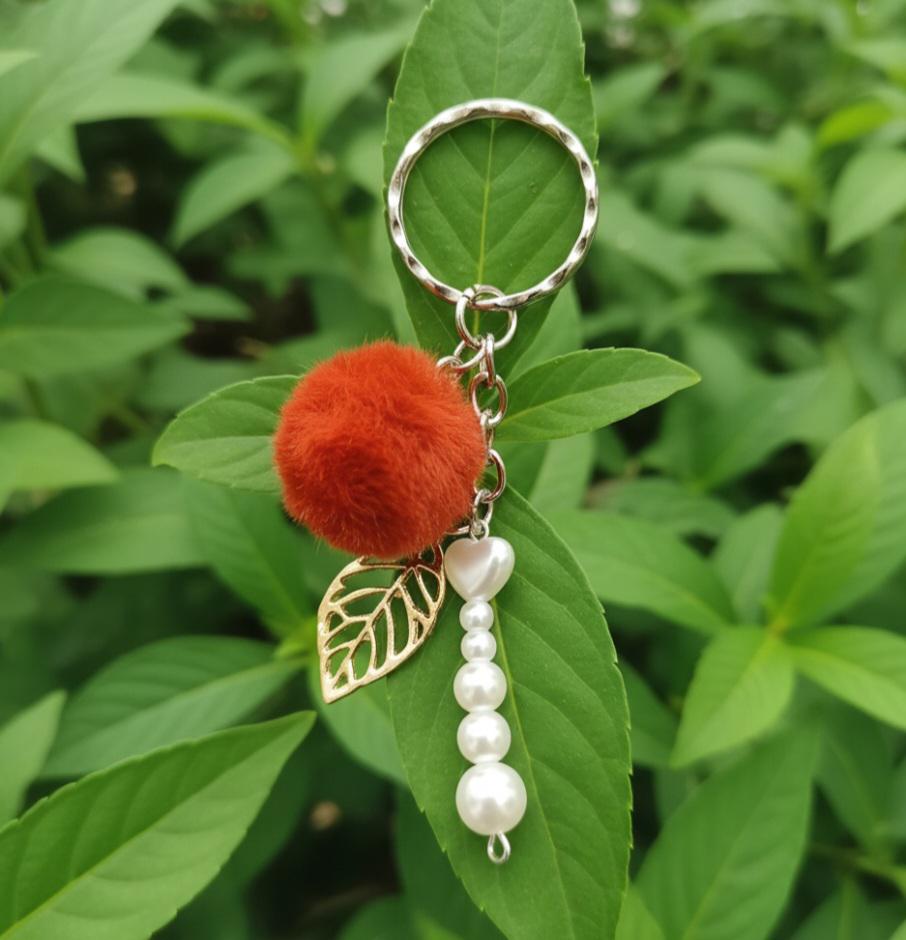 Faux pearl heart and pearls simple design charm, with pompom keychainPompom colour varies