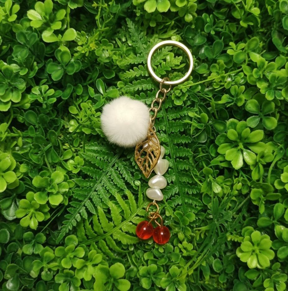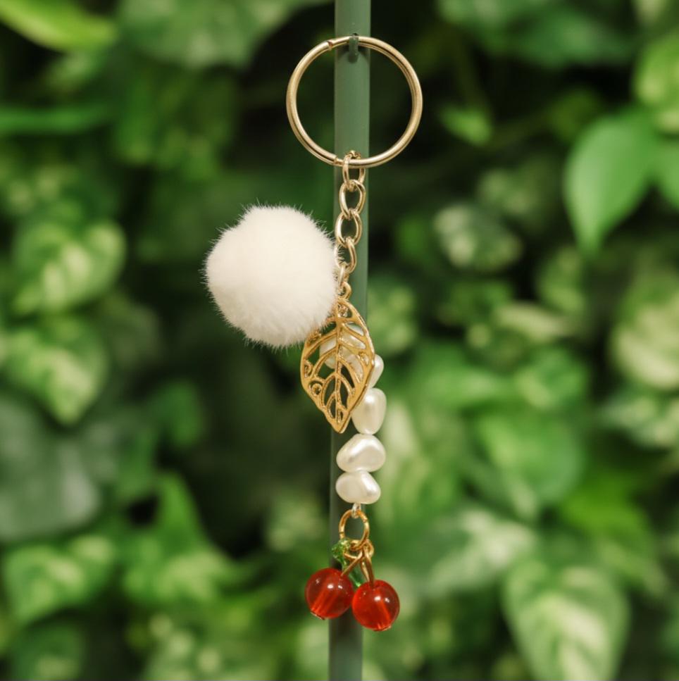 Handmade summer cherry charm keyring, with a gold leaf charm accent and faux pearlsPompom colour varies