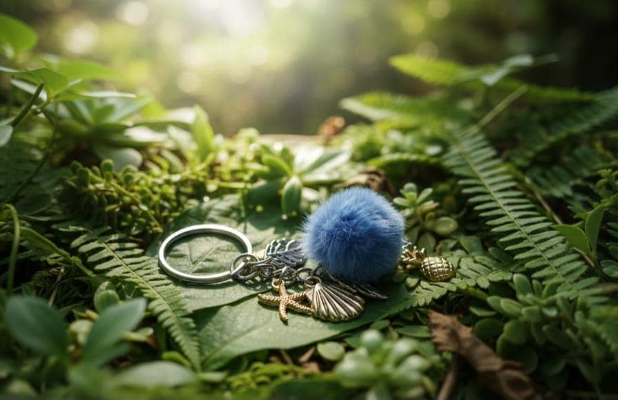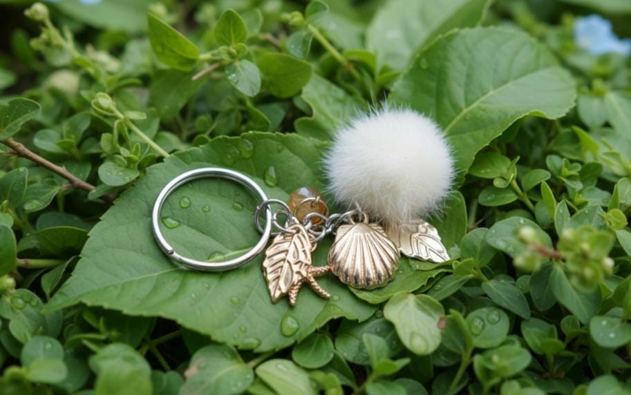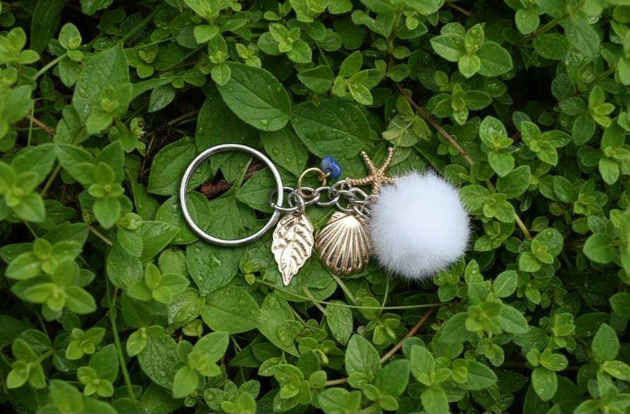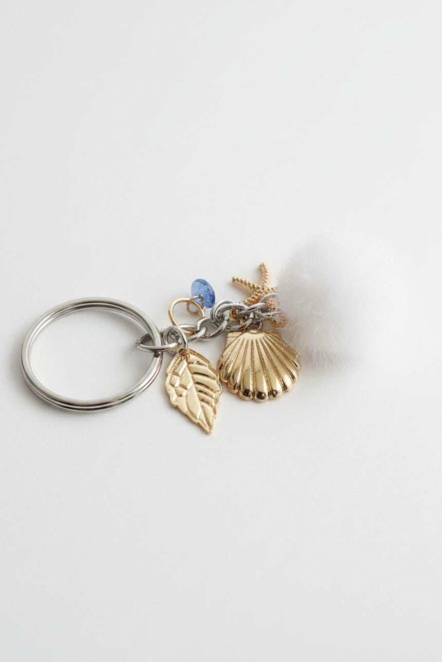 Sea inspired charm keychain with a small natural stone charmPompom colour varies