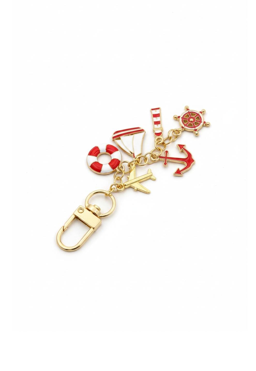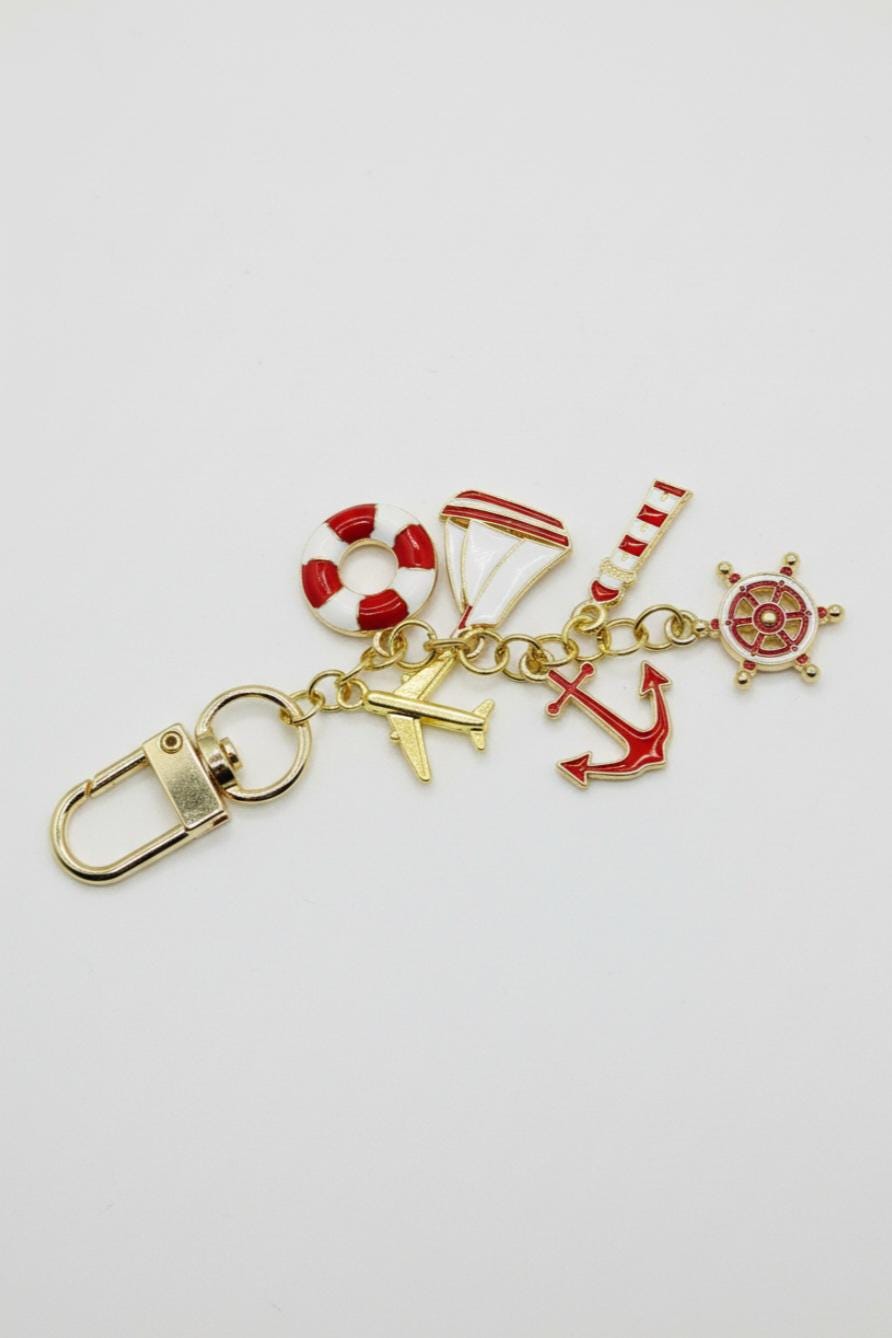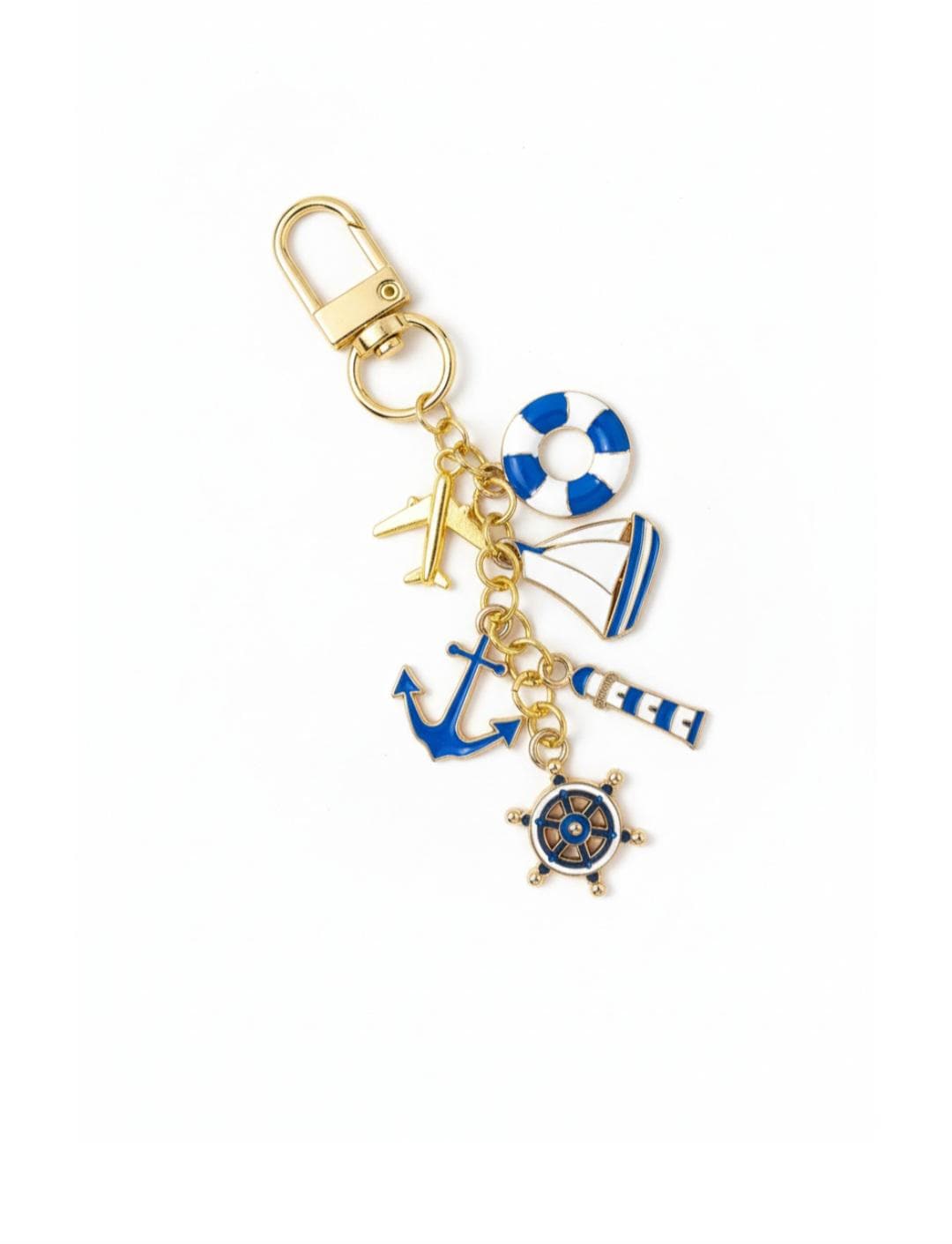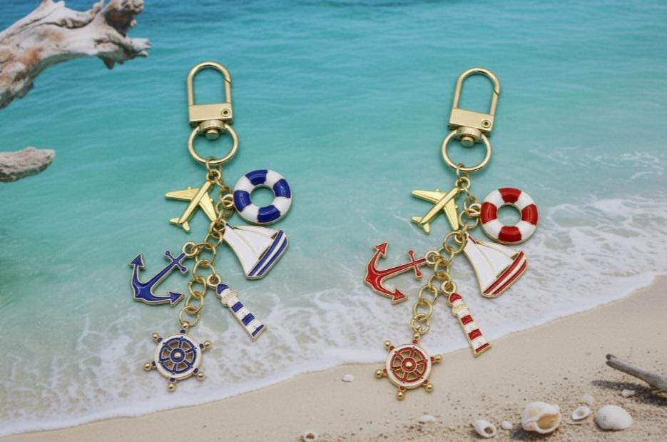 Set sail with this charming nautical keychain featuring five coastal-inspired charms: a classic anchor, sailboat, striped life preserver, lighthouse, and ship wheel. Each charm is beautifully detailed with striped accents, creating the perfect accessory for ocean lovers and coastal enthusiasts. Available in blue and white or red and white color combinations, this keychain brings a touch of seaside charm to your everyday essentials. Ideal for beach lovers, sailors, or anyone who dreams of the sea.