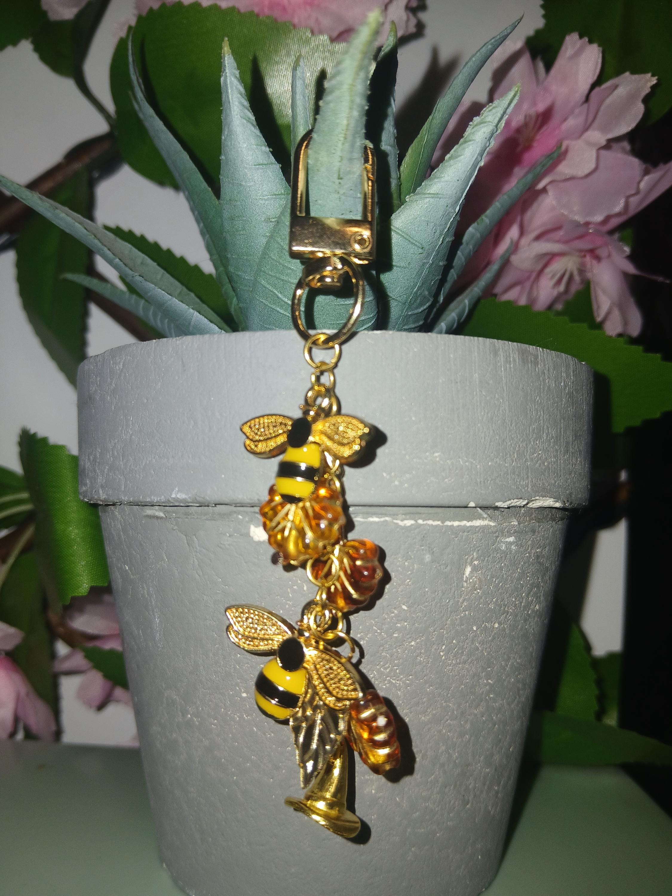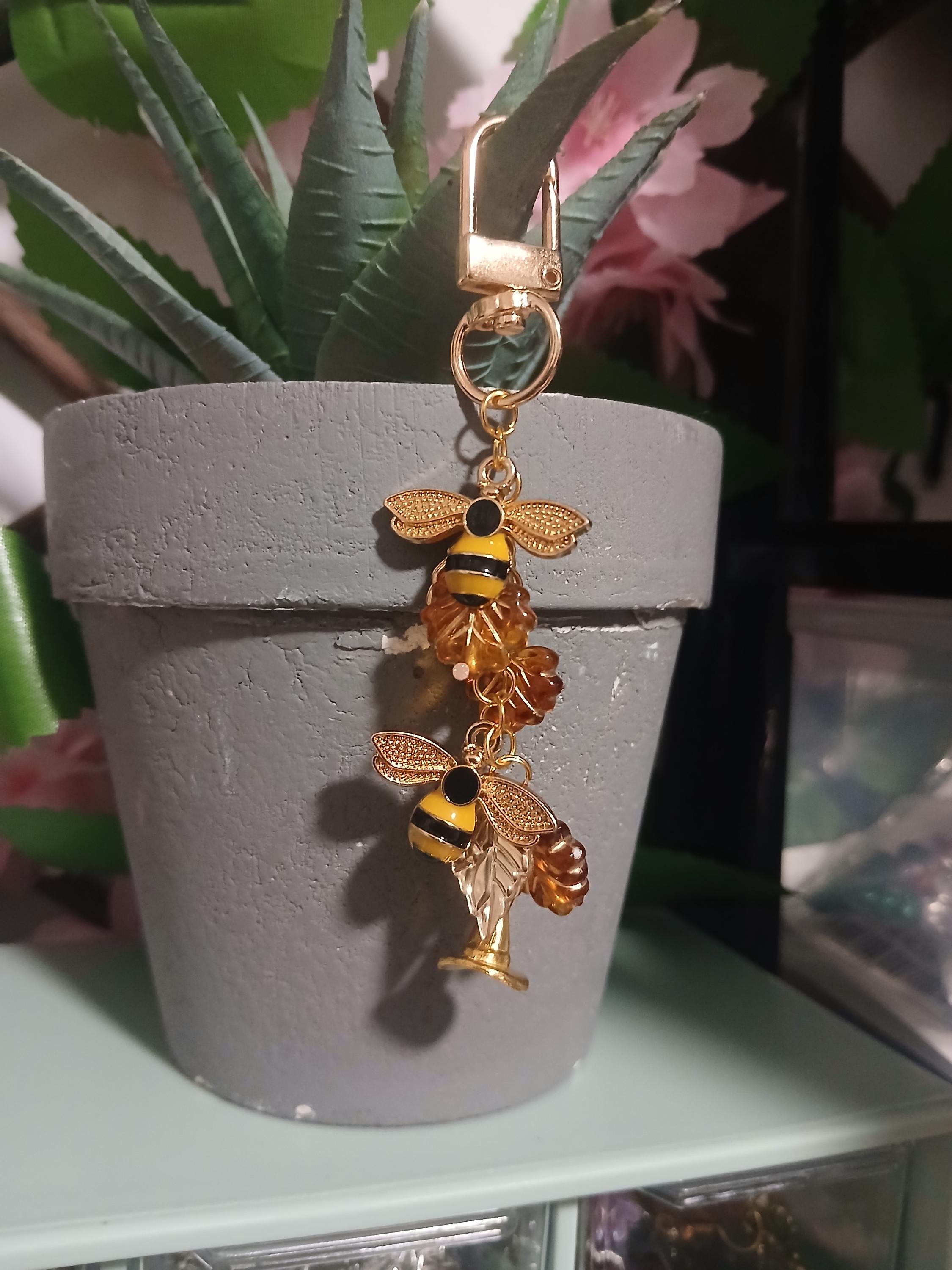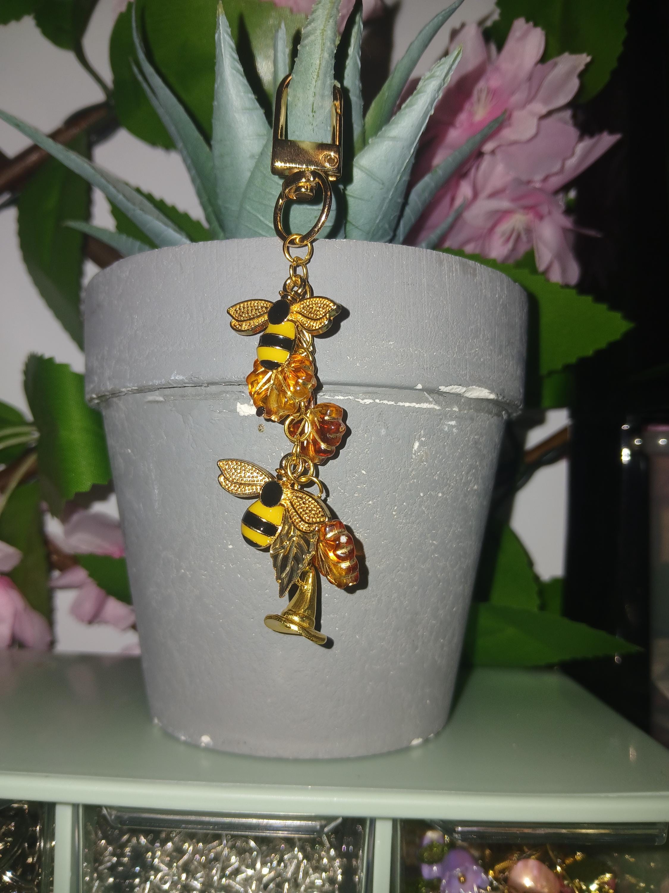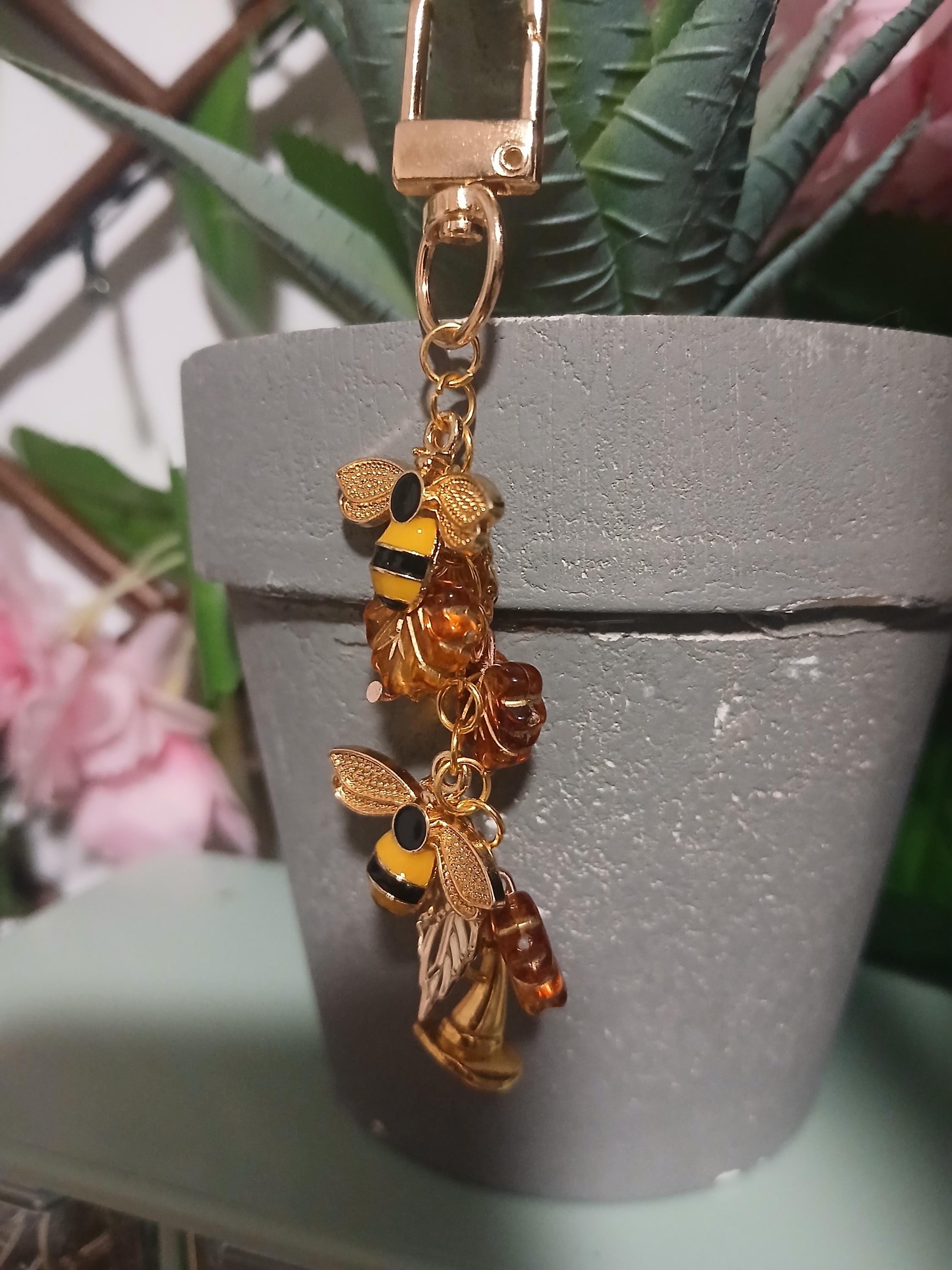 Add a touch of whimsy to your everyday carry with this charming handcrafted bee keychain. Featuring two adorable yellow and black striped bees with delicate gold-textured wings, complemented by shimmering brown-orange autumn leaf charms and finished with a golden witch's hat at the bottom. Each charm is carefully connected with gold jump rings and secured with a durable gold swivel clasp. Perfect for nature lovers, bee enthusiasts, or anyone who appreciates unique, eye-catching accessories with a magical autumn vibe.